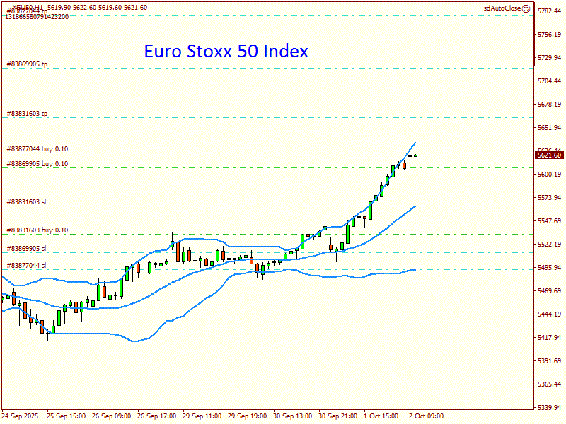 Strategia Trend follower per le fasi direzionali Time Frame: H1 Orario Segnale: 02/10/2025 09:00:19 (GMT -2) Setup: 5620,9 Stop Loss: 5493,6885 Take Profit: 5777,3145 Lotto Prudente*: 0,1 Lotto Moderato*: 0,2 Lotto Aggressivo*: 0,4 Money management consigliato: Trailing stop *: lotto normalizzato ad un capitale di 1.000